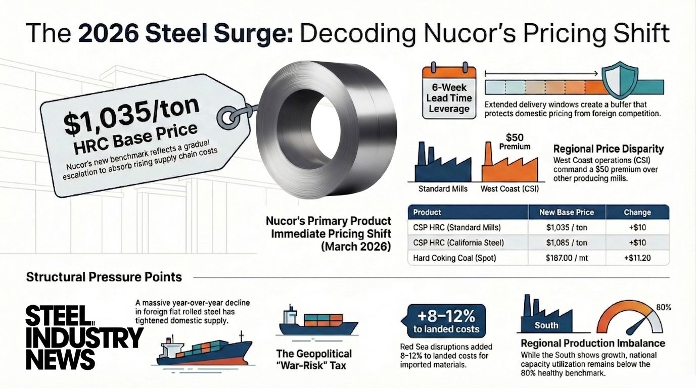 Nucor raised its hot rolled coil base price by $10 per ton effective March 30, 2026, pushing the benchmark to $1,035 per ton - a move that signals deepening cost pressure rather than a surge in end-user demand.