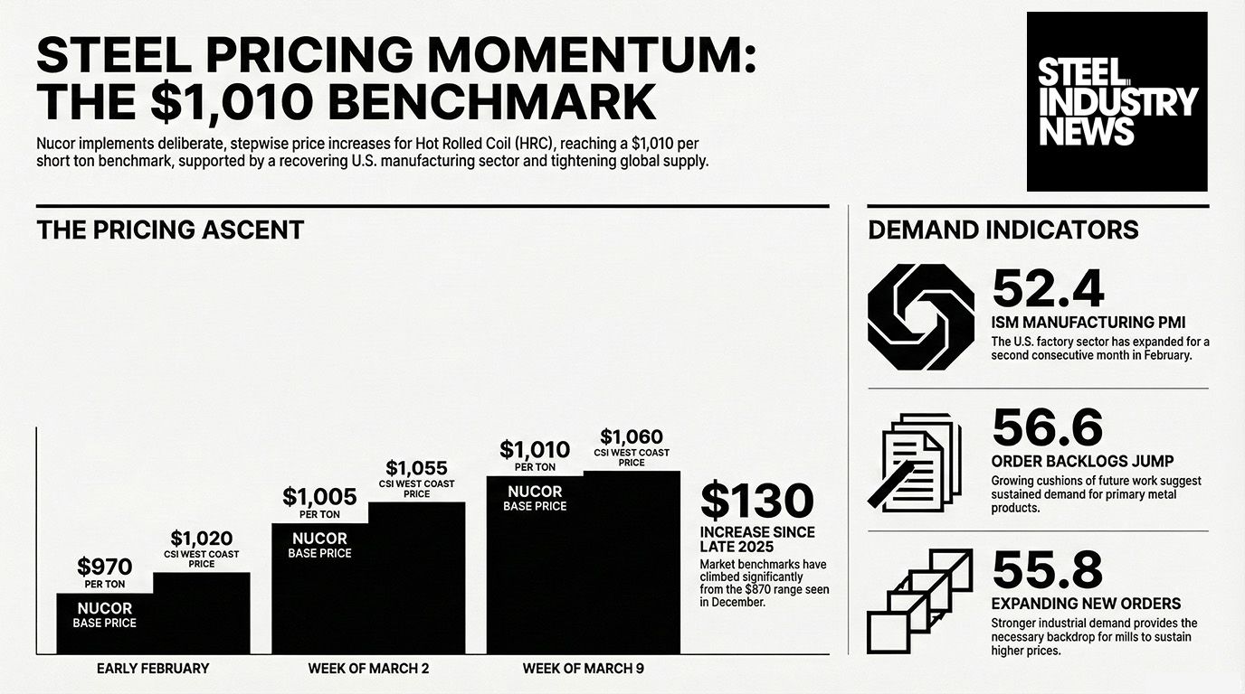 Nucor's move to a CSP HRC base price of $1,010/ton for most mills, and $1,060/ton at CSI on the West Coast, caps a series of incremental hikes that have lifted U.S. sheet prices substantially from late 2025 levels. Supported by an expanding U.S. manufacturing sector - as evidenced by the February 2026 ISM Manufacturing PMI at 52.4, with strong new orders and backlogs - this latest increase signals confidence in demand and in the company's ability to lead domestic steel price formation. For service centers, OEMs, and fabricators, it raises replacement costs and sharpens the focus on inventory timing, contract structures, and downstream pricing power.