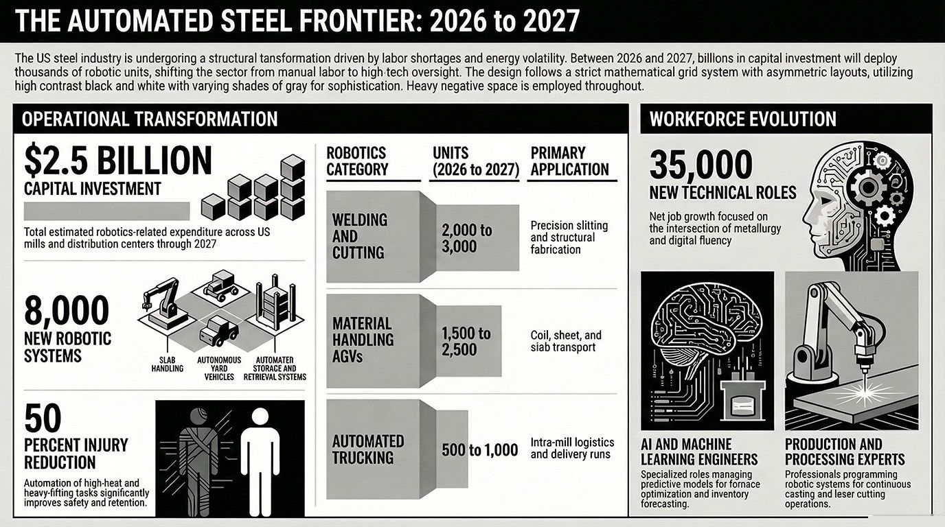 ✅ The North American steel ecosystem is projected to deploy 5,000–8,000 robotic systems between 2026 and 2027, representing $1.5–2.5 billion in capital investment across mills, distribution centers, and automated logistics networks.